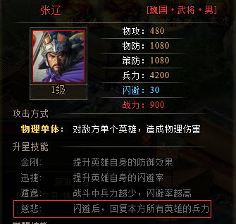 《斗三国》中,张辽是属于闪避流的武将,也是众多玩家最想招募的武将之一,因为他在战场上的作用效果可谓是同类型武将里脱颖而出。可以说拥有 张辽,就等于在斗三国拥有了无需再换的闪避武将。与其他武将相同,一星二星的张辽作用并不大,仅能靠奇缘的结合提高自身属性,但如果将张辽升到四星,那效 果可就不一般了。他与金将荀攸一样,都是闪避回血型武将,不过金将荀攸由于在物防和策防都与张辽相差甚远,最终还是会被张辽淘汰。将张辽升到四星,能觉醒 他的慈悲技能,闪避后回复本方所有英雄的兵力,是后期必备的回血将。