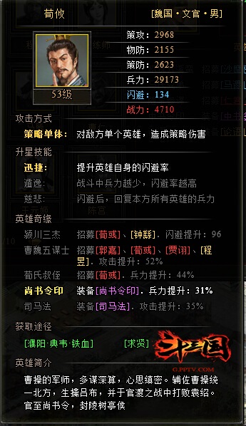 在斗三国中,荀攸走的是闪避路线,是金将当中为数不多的高闪避武将。如果说红将的张辽是闪避治疗路线最强悍的,那么荀攸就是金将中闪避的强者。作为一个 金将,属性不亚于红将,虽然攻击技能是单体伤害,但是荀攸兵力暴高,同时有群回技能,可以说仅次于奶妈型武将。通过升至三星,可以激活他的三个升星技能, 其中慈悲就是他遇到敌方攻击且闪避后,能够回复本方所有英雄的兵力。