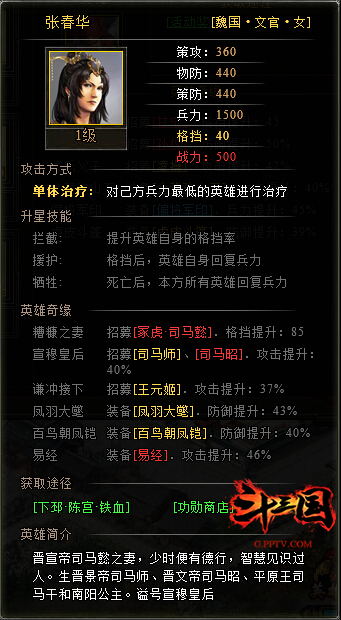 张春华在斗三国中属于金将中的女文官,其实就是奶妈,虽说她只是金将,但她在前期格挡流中可谓是非常牛逼,很明显她的存在足够让玩家玩一阵子的。基本上 可以说张春华是目前除了华佗以外唯一能配合机智、号角、擂鼓、奏乐、酒豪等技能的治疗将。兵力够多,存活能力强,同时在战场上是格挡够硬的女将,应属平民 化的奶妈,大众二奶,用了就会很舒服的!当然,如果再跟荀攸、华雄等金将搭配,战斗效果吓尿你哦!