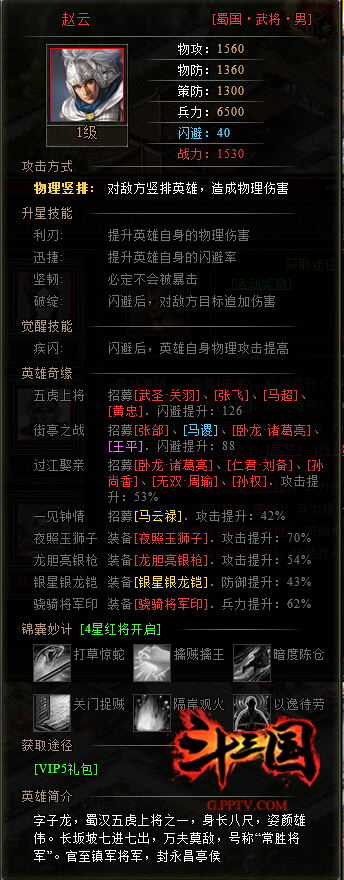 作为《斗三国》可攻可守的千年男二号,又是闪避流的赵云其实攻击伤害是很强大的,甚至升星技能的最后一个技能闪避后追加伤害更是威力十足。但既 然是男二号,一般比较搭配的是吕布、华佗、张辽等,在红将里基本很难找到更合适的闪避武将。由于他是攻守兼备的武将,所以双防能力和兵力都不突出。虽说历 史上的赵云威猛,杀伤力十足,但在游戏里他的属性表现较为一般,基本适合小R玩家。相反,土豪级别的玩家,就很难愿意选择他了,毕竟战场能力并不是最好的 武将。